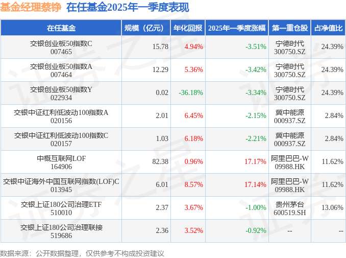 交银上证180公司治理ETF现任基金经理为邵文婷 蔡铮,本季度增聘基金经理蔡铮。其中在任基金经理蔡铮已从业12年又83天,2025年2月27日正式接手管理交银上证180公司治理ETF,任职期间累计回报为0.96%。目前还管理着9只基金产品(包括A类和C类),其中本季度表现最佳的基金为中概互联网LOF(164906),季度净值涨幅为17.17%。